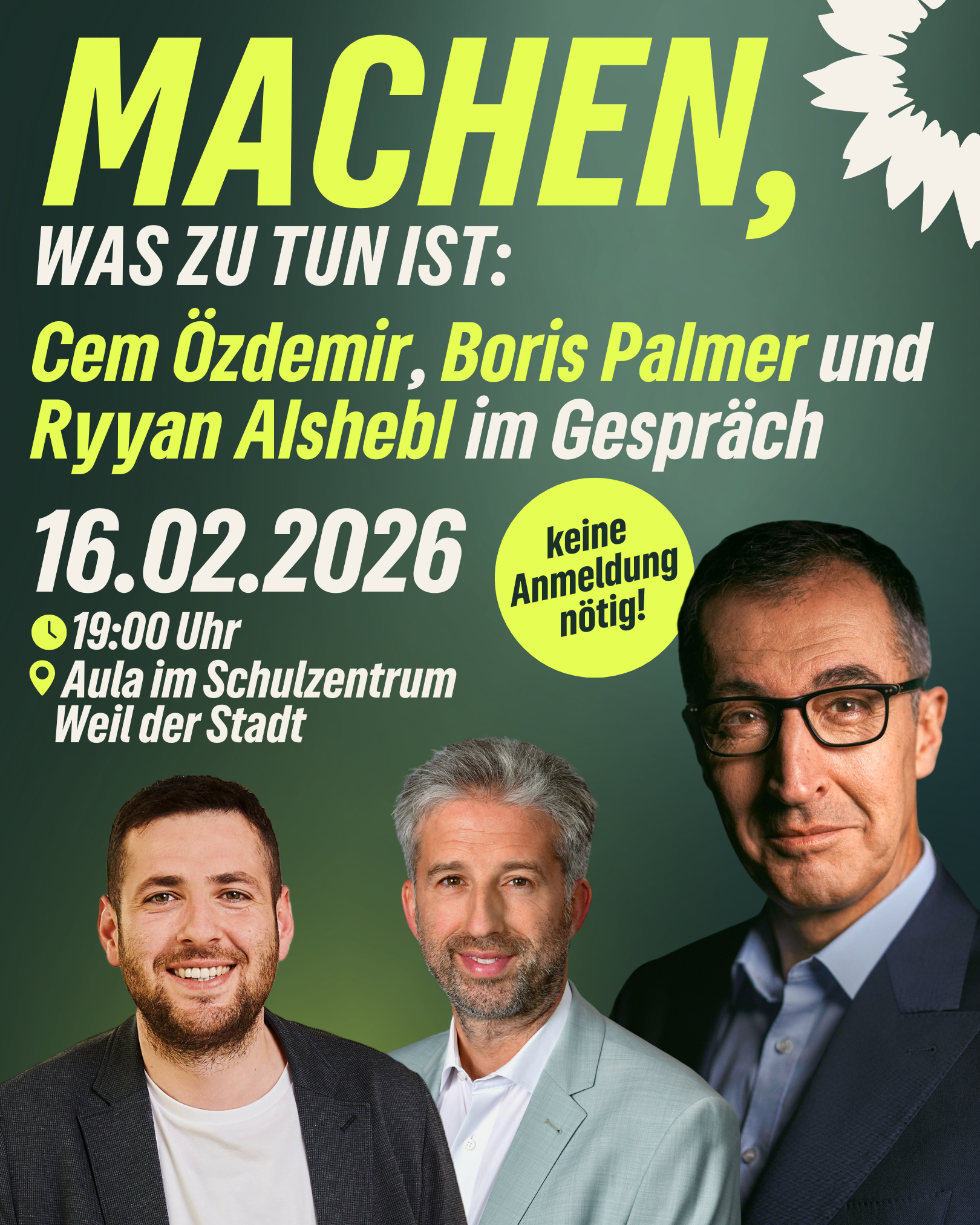 Bei einer Diskussionsveranstaltung mit Cem Özdemir, Boris Palmer und Ryyan Alshebl geht es auf Einladung von Peter Seimer MdL um einen Realitätstest. Um die Frage, warum Deutschland sich so oft selbst blockiert – und wie wir wieder mehr ermöglichen können, statt nur abzusichern. Wir sprechen über die „German Angst“ und ihre Folgen: wachsende Bürokratie, Misstrauenskultur, „Not in my Backyard“ – und die Schieflage „Bund bestellt, Kommune zahlt“. Auch die These aus Ryyan Alshebls neuem Buch steht im Raum: Verwaltungshandeln bremst, statt Lösungen möglich zu machen. Das Trio diskutiert, warum die Grünen in diesem Spagat zwischen Freiheit und Verantwortung gerade jetzt gebraucht werden und was zu tun ist.